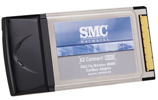 The EZ Connect™ g 802.11g MIMO Wireless Cardbus Adapter (SMCWCB-GM) enables you to connect to 802.11g or 802.11b wireless networks at home, at the office or at public hotspots. MIMO technology significantly improves the performance and range of your wireless network by using multiple smart antennae to transmit and receive the radio streams. The SMCWCB-GM provides the speed, coverage, and security expected by today’s wireless users when they communicate, download or upload large files, stream audio, video or use other bandwidth-intensive applications. The SMCWCB-GM is based on an advanced Ralink MIMO G chipset that is compliant with the IEEE 802.11g standard and certified by the Wi-Fi Alliance. This MIMO Wireless Cardbus Adapter when used in its MIMO mode with a compatible MIMO router or access point, is significantly faster than older 802.11b wireless networking devices and yet is 100% backwards compatible with them. The SMCWCB-GM significantly increases the performance of mixed-mode (802.11b and 802.11g) networks and in MIMO-only networks.