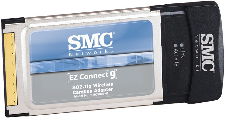 The EZ Connect™ g 802.11g 54Mbps Wireless Cardbus Adapter (SMCWCB-G) is another cutting edge introduction in 2.4GHz wireless communication for your laptop. Designed for both business and home users, this adapter provides the speed, coverage, and security expected by today’s wireless users. Based on the IEEE 802.11g standard, the new EZ Connect g Wireless Adapter is 5 times faster than the widely used 802.11b wireless networking devices and is 100% compatible with existing