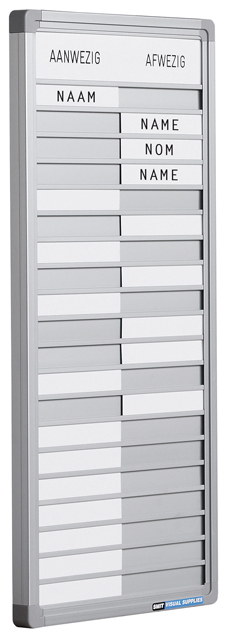Presence board with engraveable plates with 10, 20, and 30 positions. The right side of the profile is extendable so that plates can easily be replaced. Finished in an anodised aluminium Softline profile. * Supplied including blank engraving plates.