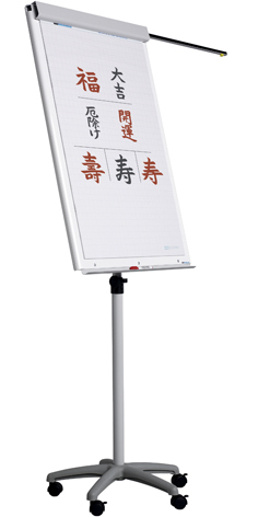 Flipchart fitted with a quick-clamp and flexible paper suspension points. Coated steel back panel. Equipped with a spring for height adjustment, two side arms for increased suspension options and a starshaped base on 5 wheels (3 braked).