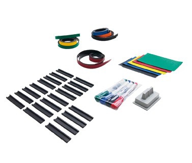 Planning set large consists of 4 different planning markers, 5 sets of various 10 mm symbols, 1 light grey mini wiper, 20 black magnetic name holders 1x5 cm, and 1200 cm of magnetic strip, which is divided over 100 cm long rolls in 6 different colours with a bandwidth of 1 cm.