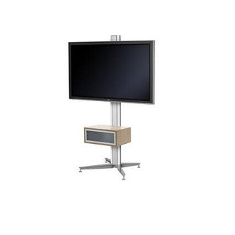 Easy and smoothly rolls screens up to 100 kg into place. The screen is mounted, and then rotated to a vertical or horizontal position. Ingenious secure universal fittings. The column has been designed such that an electrical socket can be mounted at the rear (optional extra). Shelves and cupboards are available as options (for a DVD player, for example).