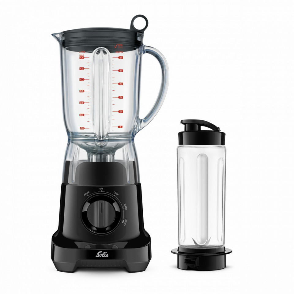 Solis Mix & Go. Type: Tabletop blender, Bowl capacity: 1.5 L, Colour of product: Black. Material jar(s): SAN, Housing material: Acrylonitrile butadiene styrene (ABS). Power: 850 W. Width: 170 mm, Depth: 180 mm, Height: 420 mm