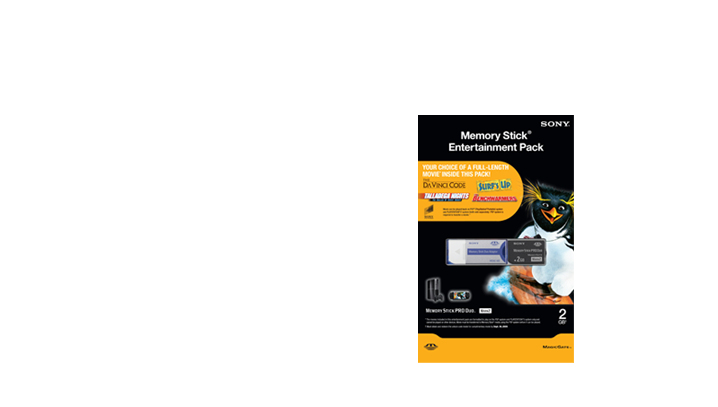 The MS-MT2GEP4 Memory Stick PRO Duo™ entertainment pack provides you not only with increased storage and durability, but your choice of a complimentary full-length movie to play on your PlayStation® Portable and PLAYSTATION®3 game system1. With a storage capacity of 2GB, this media card is perfect for compact digital photography and portable audio applications, as well as for saving your PSP® games, photos and videos. With the included adaptor, the MS-MT2GEP4 can be used in many devices that use Memory Stick PRO™ media.