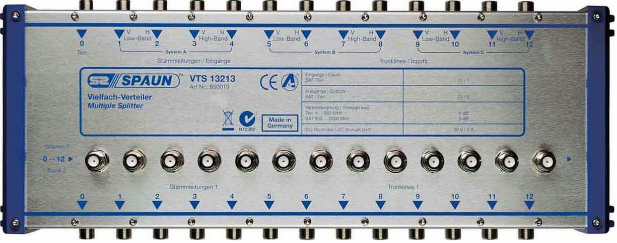 To build large digital distribution systems with multiple supply lines, the splitters reduce the installation expenditures substantially. This means, the RF signal of the terrestrial trunkline and the 16/12/8/4 SAT IF trunkline is divided in each case into two trunklines. Each trunkline has a separate DC-pass, which is connected with the respective output ports.