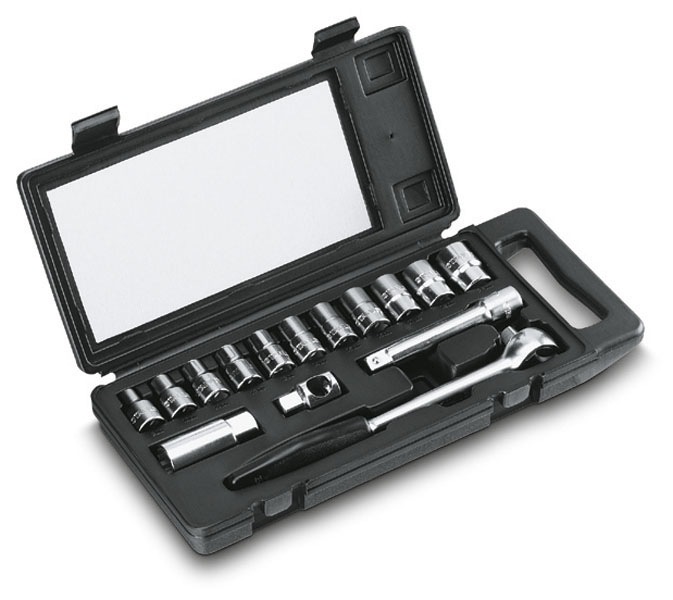 11 1/2" 12 Points bi-hex sockets: 8, 10, 11, 12, 13, 14, 15, 16, 17, 19, 22 mm. 1 1/2" Round head QR ratchet handle. 1 Extension 125 mm. 1 Drive adaptor 1/2" F to 3/8"M. 1 Spark plug socket 21mm.