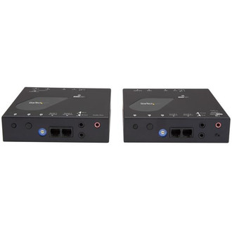 For smaller-scale applications, you can use the extender kit as a point-to-point video extender by connecting the transmitter and receiver units directly over Cat5 or Cat6 cabling for a one-to-one HDMI extension up to 330 feet (100 meters). In this configuration, a separate 3.5 mm audio source can also be extended to a separate 3.5 mm speaker system.