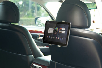 - Attaches securely to back of car seat headrest to create a backseat theater