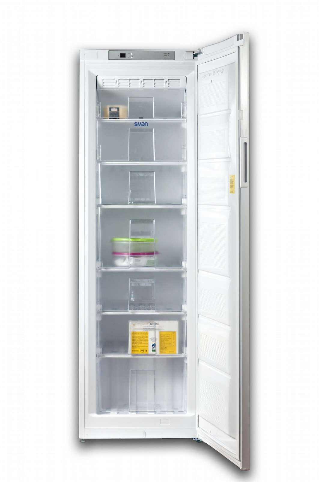 SVAN SVC1860NF. Case design: Freestanding, Type: Upright, Colour of product: White. Freezer net capacity: 251 L, Freezing capacity: 14 kg/24h, Star rating: 4*. Energy efficiency class: A+, Annual energy consumption: 323 kWh, Energy usage: 0.884 kWh/24h. Width: 595 mm, Depth: 634 mm, Height: 1850 mm