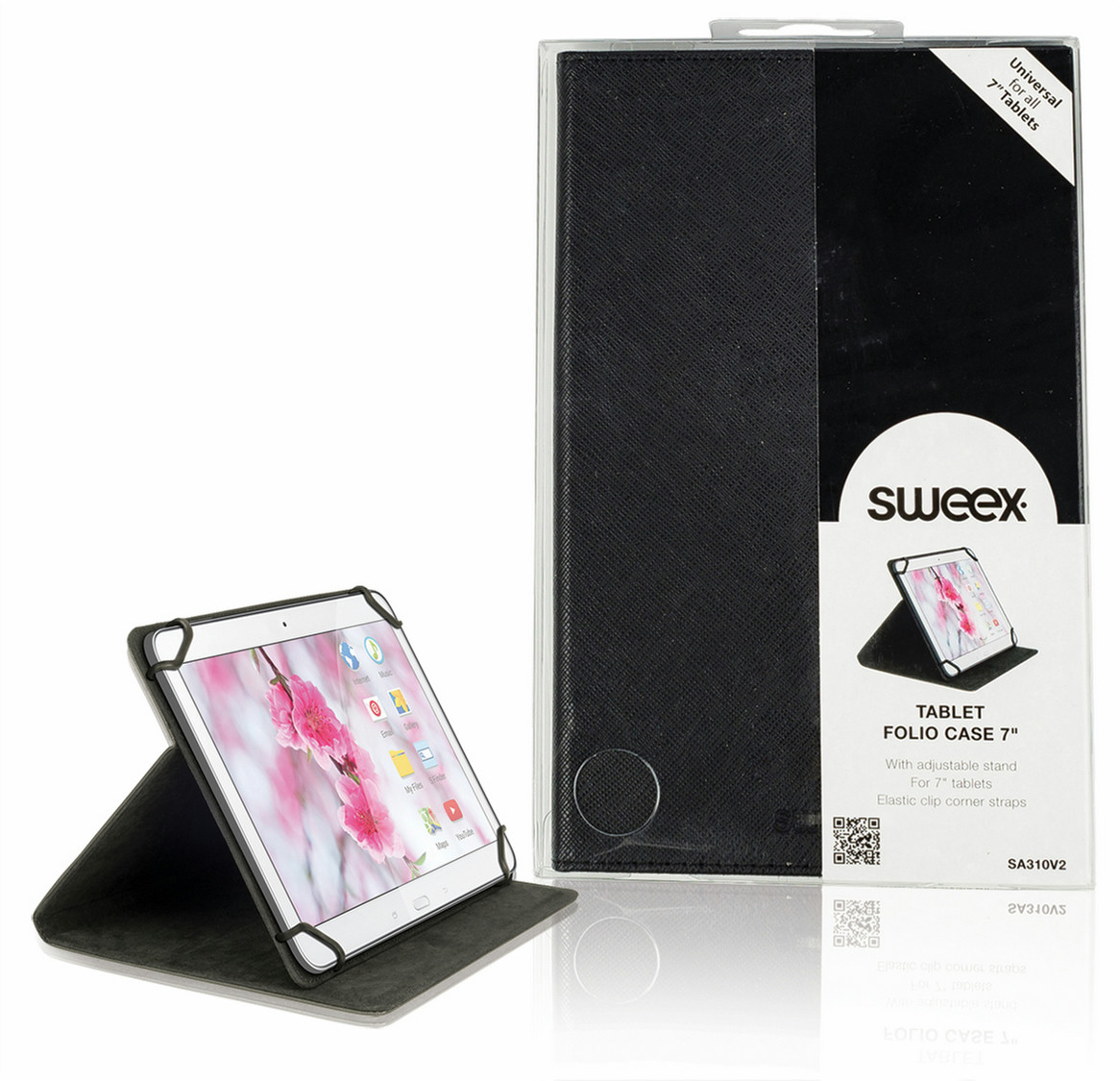 The Sweex Tablet Folio Case 7’’ protects your tablet from scratches and dirt and besides can be also used as a stand. This Tablet Case has elastic corner straps for attachment and can be established in a way to make watching videos or typing comfortable. The connections remain accessible, so you can use the tablet without removing it from the case.