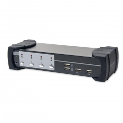 Business-class compact size 4-port KVM manages four computers with just one set of keyboard, monitor, mouse, speakers and microphone. Two additional USB ports enable additional peripherals sharing such as printer and thumb drive