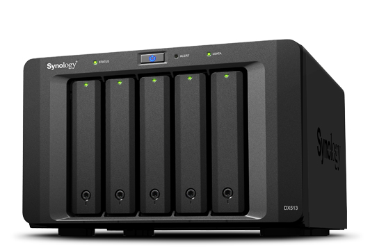 Synology® DX513 delivers an effortless solution for volume expansion and data backup for selected Synology DiskStation models. The DX513 seamlessly scales up the storage capacity of the DiskStation by additional 5 hard drives on-the-fly when connected directly to an expansion cable.