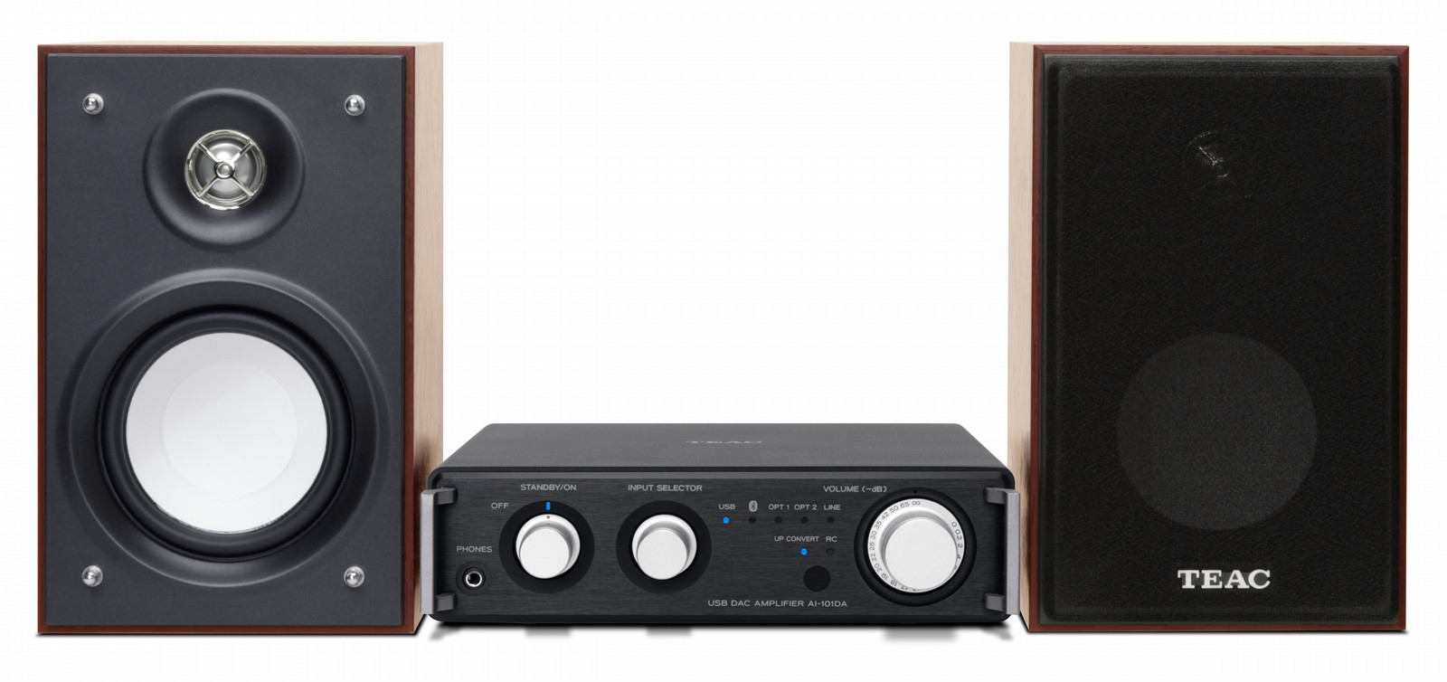 The HR-S101 is a combination of the bible-sized USB DAC Amplifier, AI-101DA and a pair of LS-101 speakers, designed all-in-one for the next generation, who mainly use a computer and smartphone. The AI-101DA allows users to enjoy both high-resolution audio streaming from a computer, and high-quality wireless audio streaming from a smartphone via Bluetooth® aptX® codec. In addition to a USB audio input and Bluetooth® connection, the AI-101DA also employs a pair of optical digital audio inputs and an analog audio input for traditional audio players like CD player or portable audio player, just in case. The secrets of the next-gen audio system are not only the versatility of its audio inputs, but the tech under its aluminum skin utilizes the latest DSP-based technology “HR Loudness” to maximize comprehensive sound performance, combining the AI-101DA and the LS-101. The AI-101DA’s compact body enables convertible layout, horizontal or vertical to fit with tiny space near TV stand or STB, while TEAC’s iconic side guard bars give a professional finish.