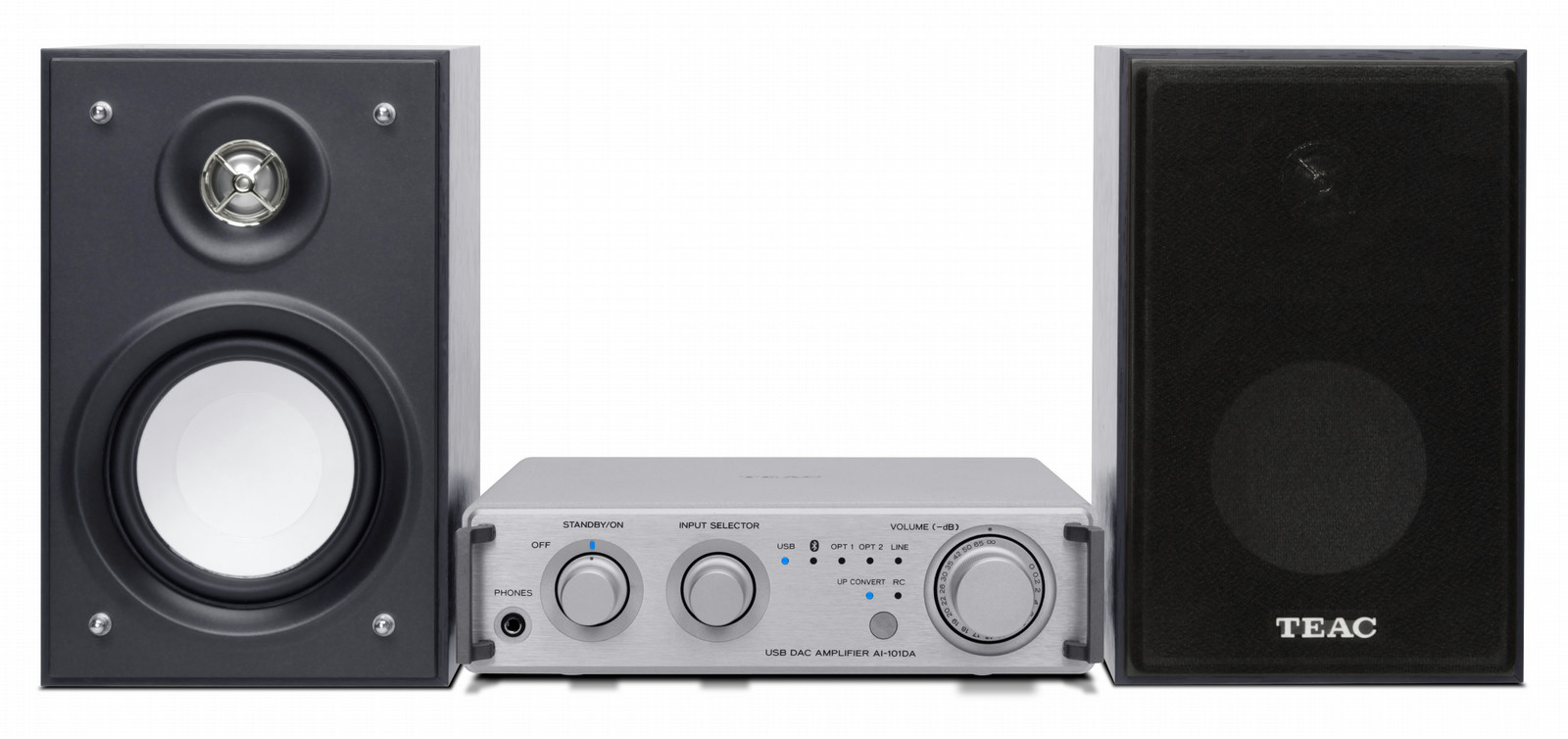 The HR-S101 is a combination of the bible-sized USB DAC Amplifier, AI-101DA and a pair of LS-101 speakers, designed all-in-one for the next generation, who mainly use a computer and smartphone. The AI-101DA allows users to enjoy both high-resolution audio streaming from a computer, and high-quality wireless audio streaming from a smartphone via Bluetooth® aptX® codec. In addition to a USB audio input and Bluetooth® connection, the AI-101DA also employs a pair of optical digital audio inputs and an analog audio input for traditional audio players like CD player or portable audio player, just in case. The secrets of the next-gen audio system are not only the versatility of its audio inputs, but the tech under its aluminum skin utilizes the latest DSP-based technology “HR Loudness” to maximize comprehensive sound performance, combining the AI-101DA and the LS-101. The AI-101DA’s compact body enables convertible layout, horizontal or vertical to fit with tiny space near TV stand or STB, while TEAC’s iconic side guard bars give a professional finish.