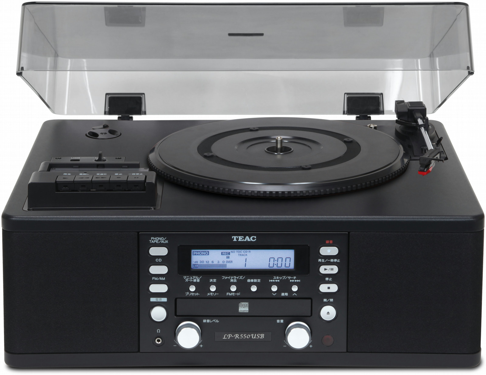 TEAC LP-R550USB is a full audio and dubbing system with turntable, CD recorder, cassette player, computer interface, and AM/FM tuner. Drop your record on the three-speed turntable, place a blank audio CD-R or CD-RW in the CD drive and hit record. Transferring your music collection into a digital, portable format couldn't be simpler. In addition to CD recording, the LP-R550USB has a cassette player/recorder and an AM/FM tuner. A pair of built-in speakers makes it the perfect desktop music system for home or office.