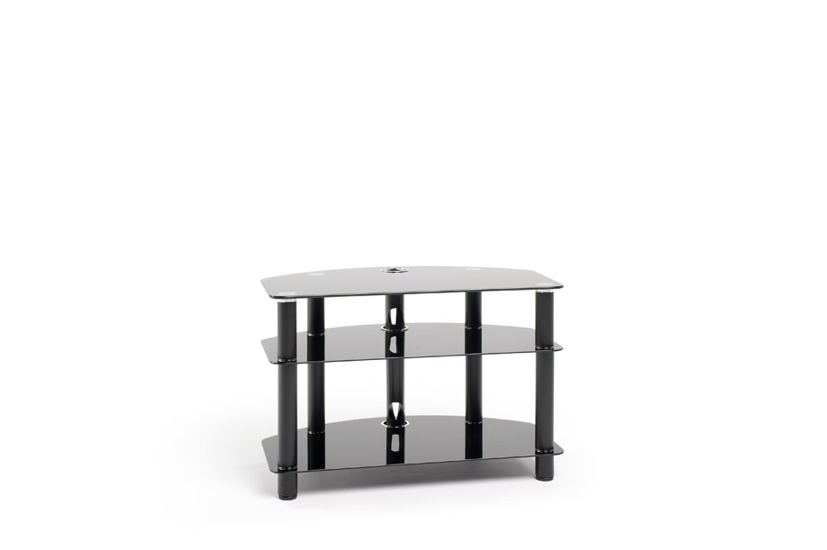 Three black glass shelves supported on tubular legs with Chrome detail and cable management. The Dais is a simple A/V support solution equally suited to corner or flat to wall placement.