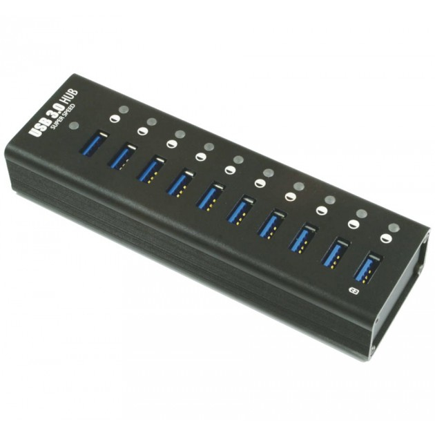 Techly 10 Ports USB 3.0 Hub with Refill Port 2.1A Aluminum IUSB3-TLYB10A. Hub interfaces: USB 3.0 (3.1 Gen 1) Type-A. Data transfer rate: 5000 Mbit/s, Certification: CE, FCC, RoHS, WEEE/RAEE. Output current: 2.1 A. LED indicators: USB, Colour of product: Black, Material: Aluminium. Windows operating systems supported: Windows 2000, Windows 7 Home Basic, Windows 7 Home Basic x64, Windows 7 Home Premium, Windows 7 Home