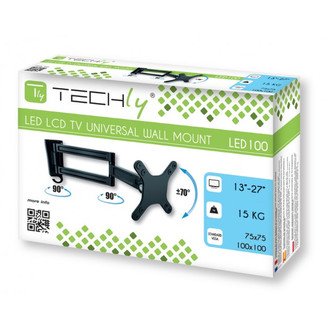 Techly 13-27" Wall Bracket for LED LCD TV Tilt 3 Joints Black" ICA-LCD 106BK. Maximum weight capacity: 15 kg, Minimum screen size compatibility: 33 cm (13"), Maximum screen size compatibility: 68.6 cm (27"). Tilt angle: -70 - 70°, Turn angle: 90°, Distance to the wall (max): 38.2 cm. Colour of product: Black, Material: Aluminium. Height: 154 mm, Weight: 1.24 kg, Depth (min): 5.5 cm