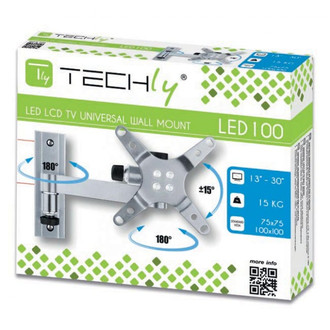 Techly 13-30" Wall Bracket for LED LCD TV Tilt 2 Joints Silver" ICA-LCD 105. Maximum weight capacity: 15 kg, Minimum screen size compatibility: 33 cm (13"), Maximum screen size compatibility: 76.2 cm (30"). Tilt angle: -15 - 15°, Swivel angle range: 0 - 180°, Distance to the wall (max): 8.1 cm. Colour of product: Silver, Material: Aluminium. Width: 116 mm, Height: 152 mm, Weight: 850 g. Number of products included: 1 pc(s)