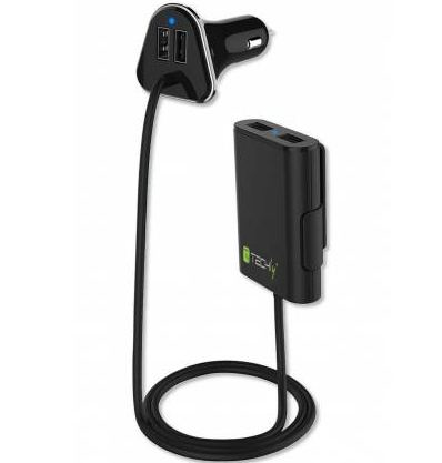 A 1.8m long cable connects the 2-ports USB car charger to a 2-ports USB hub that makes it possible even for rear passengers to recharge smartphone and tablet.
