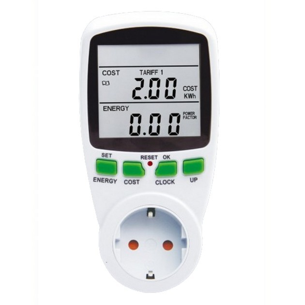 Techly Detector of Power Consumption and Energy Costs IPW-ADP-ENM2. Display: LCD. Power source type: AC, Maximum current: 16 A, Maximum power: 3680 W. Battery type: LR44. Weight: 345 g