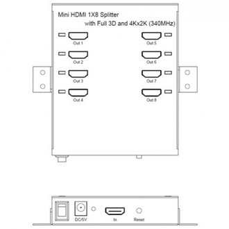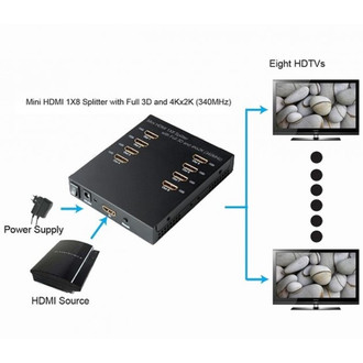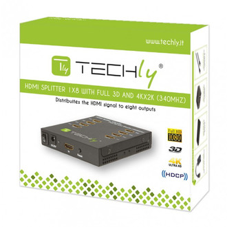 Techly HDMI Splitter 8 Way Full 3D High Resolution 4K IDATA HDMI4-18. Video port type: HDMI. Supported graphics resolutions: 3840 x 2160, 1920 x 1080 (HD 1080), Maximum resolution: 3840 x 2160 pixels, Supported video modes: 1080i, 1080p, 2160p, 480i, 480p, 576i, 576p, 720p. Colour of product: Black. Power consumption (typical): 16 W. Certification: CE, FCC, UL