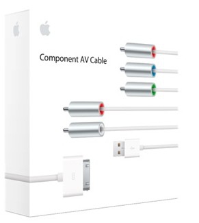 The Component AV Cable connects to your device or Universal Dock via the 30-pin dock connector and to your TV, home theater receiver, or stereo receiver via the component (Y, Pb, and Pr) video and red/white analog audio ports. The cable also features a USB connector that you can plug into a power source, such as a computer or the USB Power Adapter, available separately.