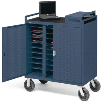 Bretford's laptop storage cart stores and charges up to 30 notebook computers. The all steel construction with multiple-point locking doors and padlock deters theft and helps ensure the security of equipment.
