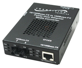 Transition's AC powered PoE media converters combine data received over a fiber optic link with -48VDC power; providing power to Data Terminal Equipment (DTE) Power Devices (PD) over unshielded twisted pair cable. The PoE converters are Power Sourcing Equipment (PSE) and are fully compatible with Powered Devices (PD) that comply with the IEEE802.3af™: 2003 standard. The converters also include a PD signature sensing and power monitoring features per the IEEE 802.3af standard. Other features include Over-Current Protection, Under-Current Detection and Fault Protection Input.