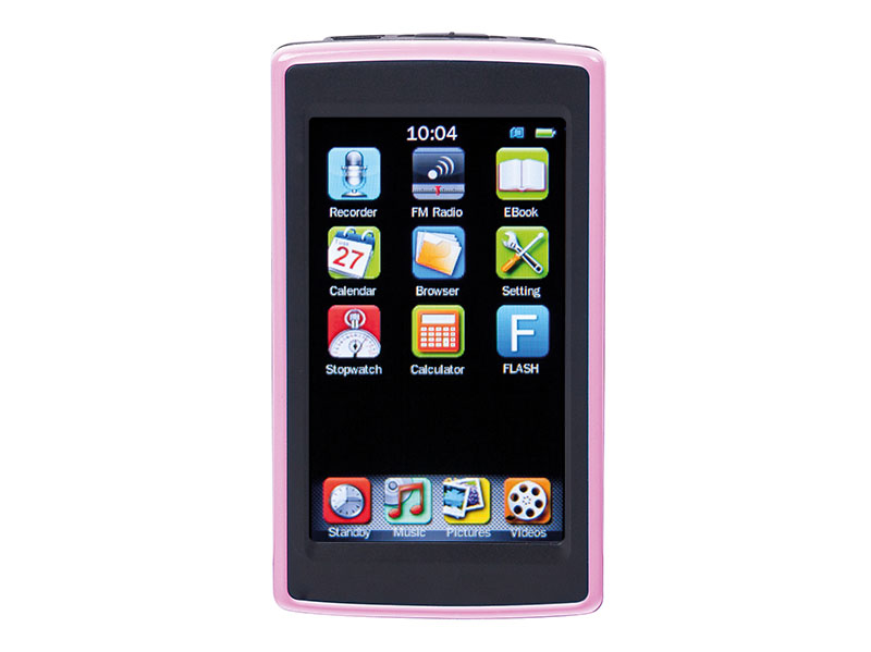 Trevi TSV 1950 SD. Type: MP3. Colour of product: Pink. Player media type: Flash-media, Total storage capacity: 4 GB, Compatible memory cards: microSD (TransFlash). Display: LCD, Display diagonal: 7.62 cm (3"). Audio formats supported: AAC, APE, FLAC, MP3, OGG, WMA, Video formats supported: 3GP, AVI, FLV, MP4, RMVB, Image formats supported: JPG