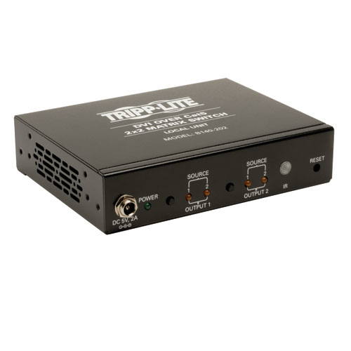 Tripp Lite's B140-202, 2X2 DVI Matrix Switch allows two DVI Single-Link video sources to be routed to one or two RJ45 outputs and extended up to 45.72 m (150-ft.) @ 1920x1200 using Active (powered) Receiver, or up to 15.24 m (50-ft.) @ 1920x1200 using Passive (non-powered) Rec. Switching between sources is done manually or with included remote control. Additional monitors can be added beyond the typical two by using Tripp Lite B140-110 daisy-chain Receivers - up to 4 monitors per channel.