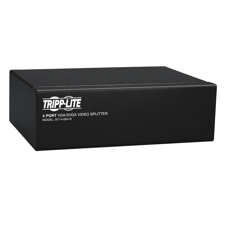 Tripp Lite's 4-Port VGA/SVGA Video Splitter provides bandwidth support at 350MHZ, allowing simultaneous display of video on up to 4 monitors. In addition, a built-in booster allows a video signal (up to 2048 x 1536 @ 60Hz) to be transmitted up to 210 ft. from the source. Four standard HD15 female ports are used to connect the monitors, while a fifth HD15 male port is used to connect the CPU. The splitter can be located up to 25 ft. from the connected computer, and up to 185 ft. from the connected monitors. The number of connected monitors can be expanded by cascading up to 3 levels of B114-004-R splitters together.