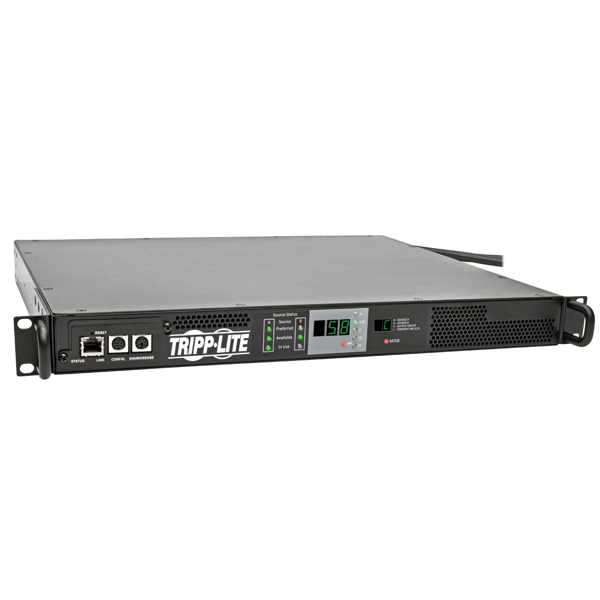 - Reports source A and source B input power status and other information, including power availability, line voltage, frequency, amps, kilowatts and power factor
