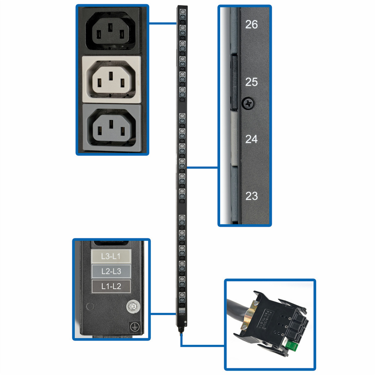 The 54 single-phase 12A IEC-C13 outlets receive power from the connected ATS PDU. The outlets are interlaced to help you balance loads by spreading connections across the phase combinations(L1-L2, L2-L3, L3-L1) throughout the rack. Each outlet is numbered and color-coded to help you keep track of connected devices and which phase combination powers each. The 2.5-foot power cord with 8-position plug connects directly to the PDU’s rear receptacle.