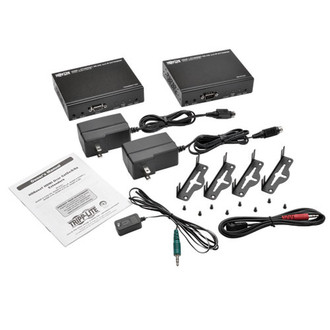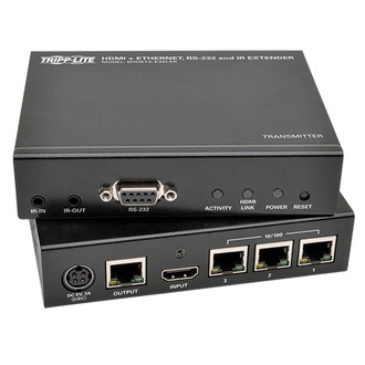 The BHDBT-K-E3SI-ER HDBaseT HDMI over Cat5e/6/6a Extender Kit extends uncompressed HDMI audio and video, RS-232 serial and IR remote control signals up to 152.4 m (500-ft.) over a single Cat5e/6/6a cable, including a 1920 x 1080 (1080p) signal @ 60 Hz. In addition to HDMI, RS-232 and IR signals, this extender kit features three built-in 10/100 Ethernet ports on both the transmitter and receiver units. This allows connected devices, such as a Blu-ray™ player, cable/satellite box, and HDTV, to communicate with each other and access online content via LAN. You can also control RS-232 serial devices, such as touchscreen displays or scanners, at baud rates up to 115 Kbps. The two-way IR remote control feature (@ 39 KHz) lets you control your Blu-ray player using its remote when at the remote monitor or control your remote monitor using its remote when at the Blu-ray player. Locking HDMI ports (ideal for use with Tripp Lite’s P569-006-LOCK high-speed HDMI cables with locking connectors) on both the transmitter and receiver prevent cables from coming loose or undone, ensuring an intact signal. The plug-and-play BHDBT-K-E3SI-ER supports 7.1-channel surround sound, DTS-HD and Dolby TrueHD audio, as well as 3D video, EDID and HDCP.