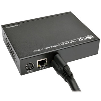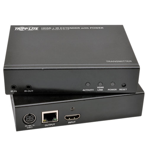 The BHDBT-K-PI-LR HDBaseT HDMI over Cat5e/6/6a Extender Kit extends uncompressed HDMI audio and video and IR remote control signals up to 99.97 m (328-ft.) over a single Cat5e/6/6a cable, including an Ultra High Definition (UHD) 3840 x 2160 (4K x 2K) signal. In addition to HDMI and IR signals, this extender kit features built-in PoE technology, which powers the receiver over Cat5e/6/6a cable, eliminating the need for an external power source. The two-way IR remote control feature (@ 39 KHz) lets you control your Blu-ray player or other HDMI source using its remote when at the remote monitor or control your remote monitor using its remote when at the Blu-ray player. Locking HDMI ports (ideal for use with Tripp Lite’s P569-006-LOCK high-speed HDMI cables with locking connectors) on both the transmitter and receiver prevent cables from coming loose or undone, ensuring an intact signal. The plug-and-play BHDBT-K-PI-LR supports 7.1-channel surround sound, DTS-HD and Dolby TrueHD audio, as well as 3D video, EDID and HDCP. Attach the transmitter and receiver units to a wall, rack or pole with the included mounting hardware.