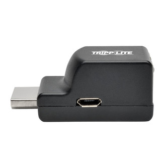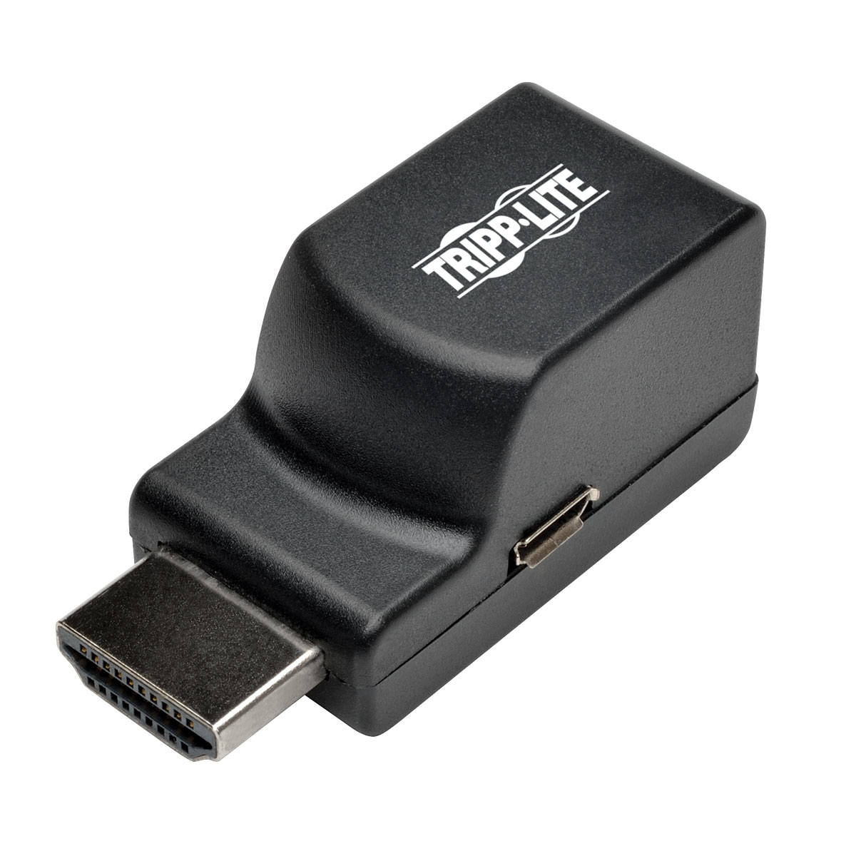 The compact, low-profile design helps hide the unit from view. The B126-1P0-MINI’s built-in HDMI male connector plugs directly into the monitor. The unit can extend a 1080i (@ 60 Hz) signal up to 100 feet (30.5 m) or a 1080p (@ 60 Hz) signal up to 50 feet (15.2 m) with a single Cat5e/6 cable. For best results, use 24 AWG solid-wire Cat5e/6 cable (such as Tripp Lite’s N202-Series) between this unit and the transmitter.