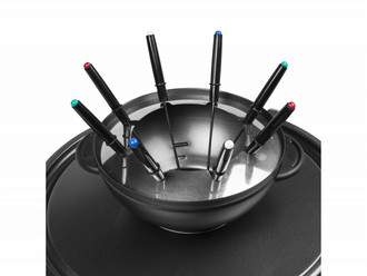 Multifunctional 4 in 1 funcook experience! Usable for delicious fondue, teppan yaki grilling, raclette and gourmette! You can easily control your temperature with the adjustable thermostat. Enjoy a cozy meal with 8 high quality pans and 8 forks!