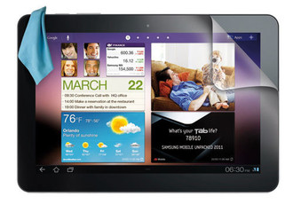 3 adhesive transparent sheets. Protection against scratches. 100% clear transparent material. Anti-static and washable surface. Including cleaning cloth and card for applying. For Galaxy Tab 10.1.