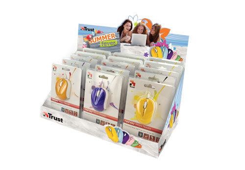 Colourful, beach style counter display for 3x5 pieces of Trust Nanou mice, ideal for a summer promotion Counter display for 3x5 pieces of Trust Nanou mice. With integrated topcard and full colour printing in colourful beach style, ideal for a summer promotion. Can be placed on counter, pallet with products etc to create extra in-store space; generating extra turnover. Perfect for stimulating impulse buying. Dimensions (HxWxD): 340 x 400 x 255 mm.