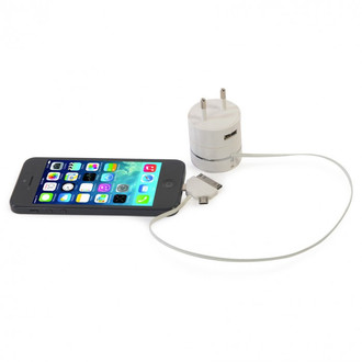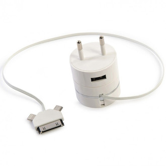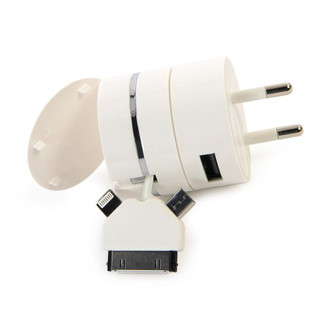 Mains adaptor with retractable cable; recharges many compatible devices thanks to the three different connectors supplied. Includes an additional side USB port for charging other devices. Ideal for connecting, recharging and synchronising devices compatible with the three connectors provided: Micro USB, 30-pin and 8-pin. The cable retracts into the case and the plugs are housed in the upper section, making this mains adaptor compact and easy to carry.