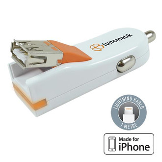 Tuncmatik TSK4545. Charger type: Auto, Charger compatibility: MP3, MP4, Mobile phone, Tablet, Power source type: Cigar lighter. Colour of product: Orange, White. Input voltage: 12 - 24, Output voltage: 5 V. Width: 64.6 mm, Depth: 15.7 mm, Height: 23.5 mm
