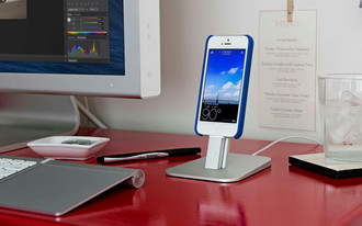 HiRise Deluxe is a beautiful metal pedestal for charging and hands-free use of your iPhone or iPad. Set HiRise on your desk for hands-free calls and eye-level FaceTime sessions, or use this small stand at home to keep iPhone fully charged while streaming music to your favorite speaker. Adjustable support posts makes HiRise compatible with most iPhone and iPad cases and shells. HiRise Deluxe includes both MFi-certified Lightning and Micro-USB cables to keep your iPhone charged, even in a battery case like the Mophie Juice Pack. HiRise Deluxe is available in Silver, Black and Gold to match your iOS device. Compare HiRise Deluxe to HiRise Original