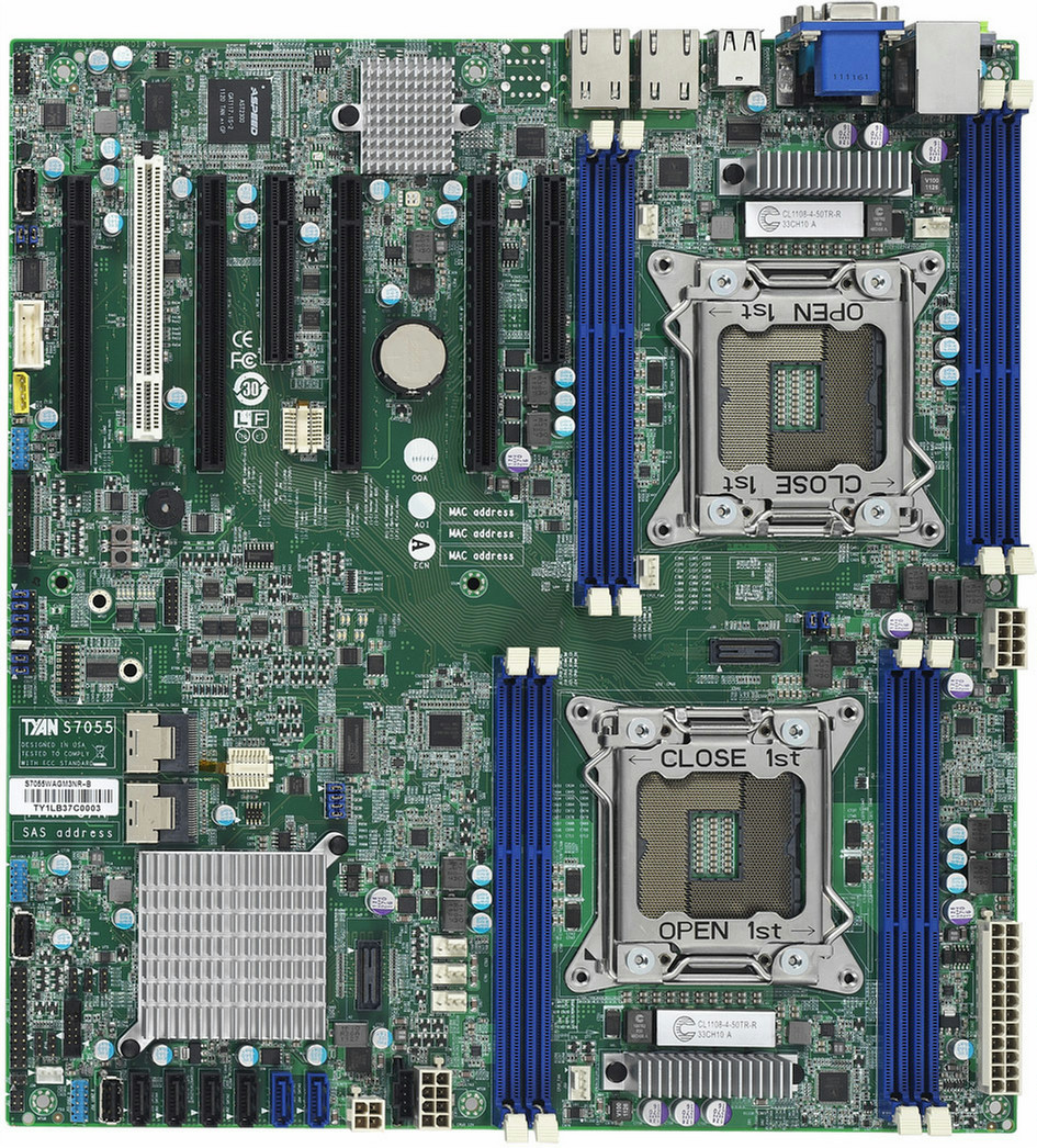 2xLGA2011, 8.0 GT/s, Intel C602, 8xDIMM, 4xPCI-E x16, 1xPCI-E x8, 1xPCI, 3xLAN, 4xSATAII, 2xSATAIII, 1xVGA, 4xUSB, 1xCOM, SSI EEB