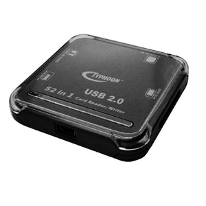 Read and Write with 52 different types of memory cards in your computer. The Typhoon All-In-One USB Card Reader is Plug&Play USB 2.0 compliant and works at USB Hi-Speed transfer speed. Small and compact, the product allows you to read/write virtually almost any digital camera or multimedia player memory cards into your computer.
