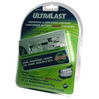 Ultralast Camcorder Battery Charger - 3.6V,7.2V Multi-Voltage (110-220V) for Li-Ion Camcorder batteries - for Canon BP511 series; BP-914 series; JVC BN-V107U/V114U, BN-V408U series; Panasonic CGA-DU07 series, VW-VBD07 series; Sony NP-F500 series, NP-QM series, NP-FP series, NP-FH series; Samsung SBL-110, L-220, SB-LSM80, 160, 320