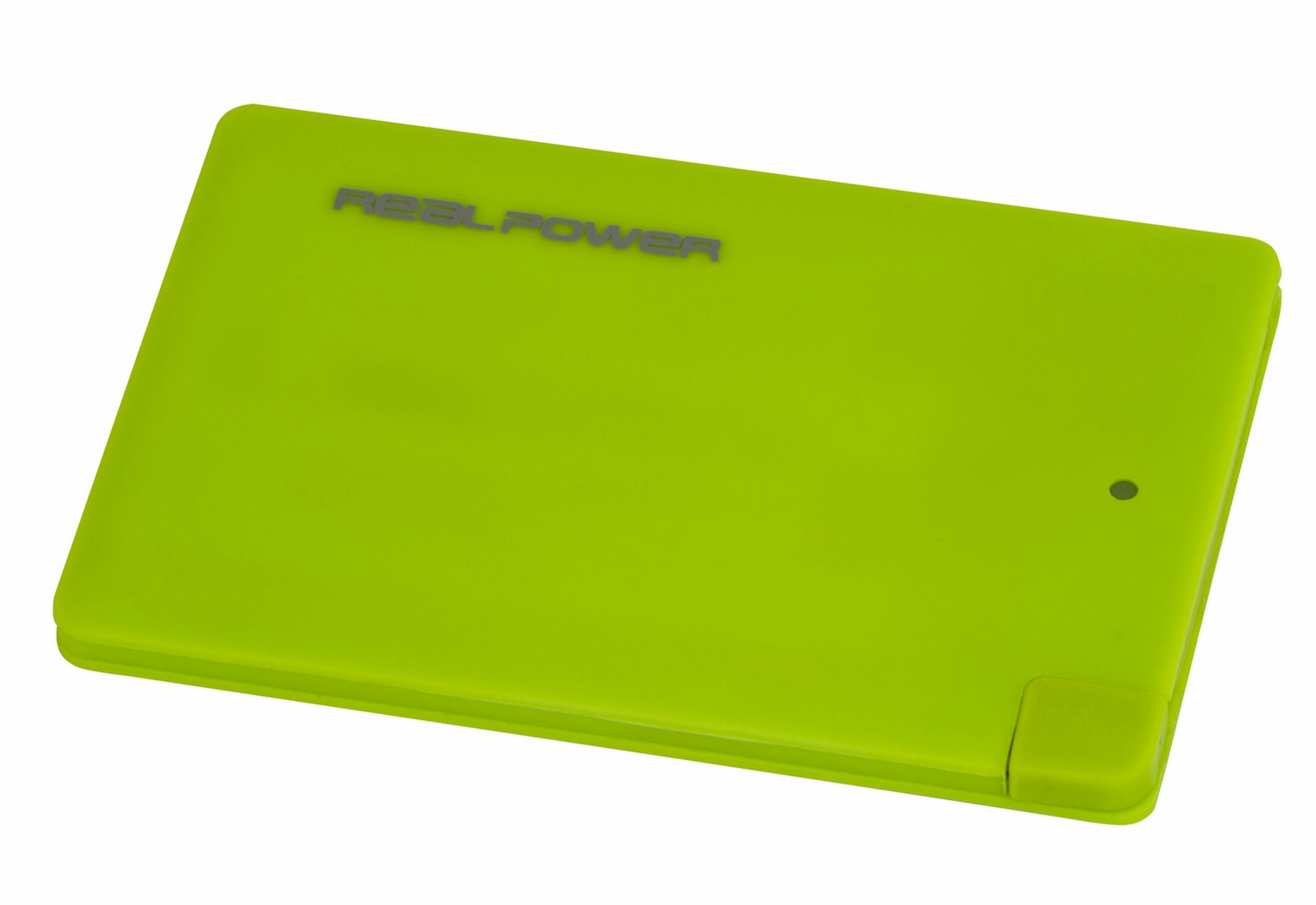Ultron RealPower PB-2500. Colour of product: green, Charger compatibility: Universal. Battery capacity: 2500 mAh. Width: 96 mm, Depth: 62 mm, Height: 8 mm. Adapters included: Lightning