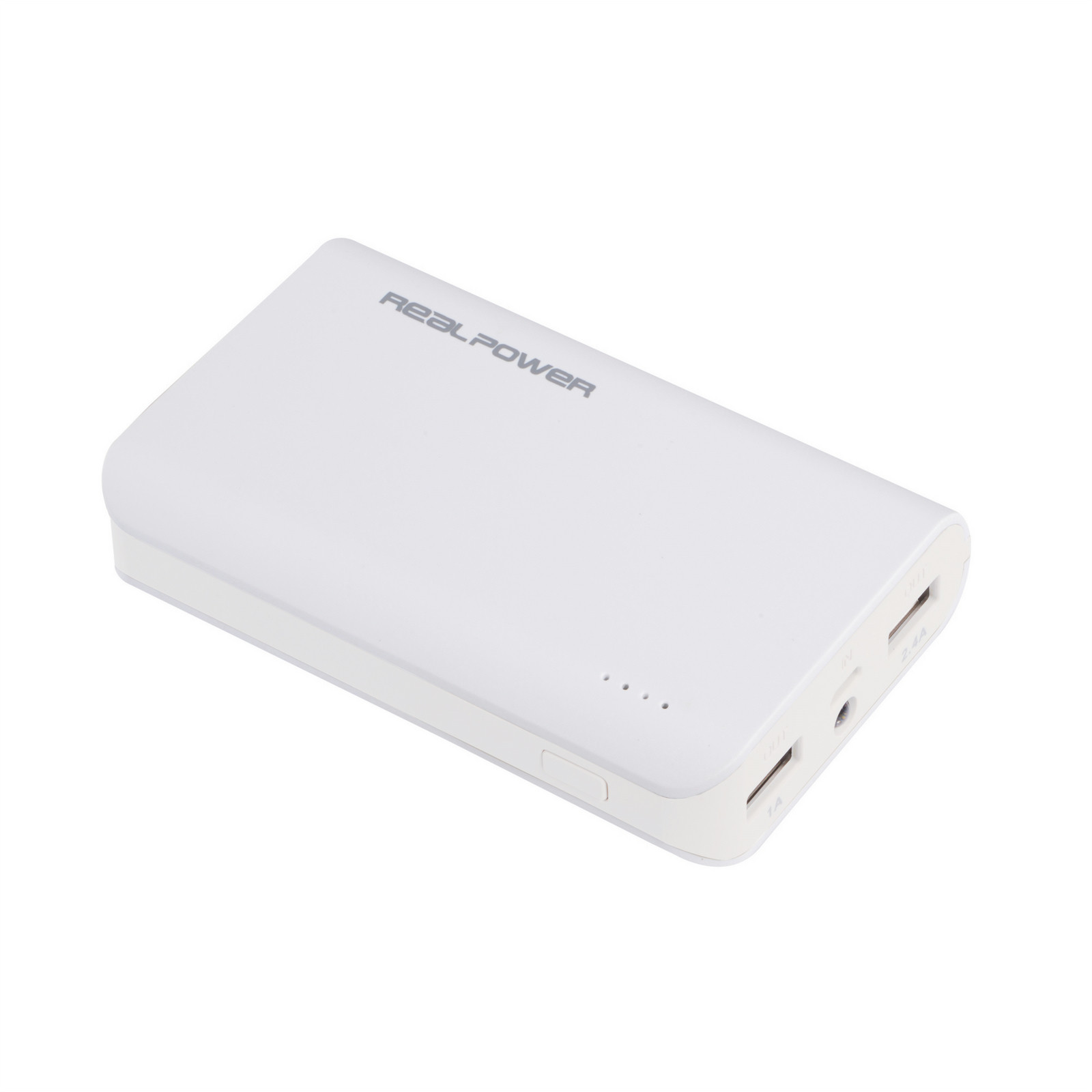 RealPower PB-6001, 6000mAh, 5V 1000mA/2400mA The portable 6000 mAh battery of the RealPower PB-6K charges two smartphones at the same time. The device can be plugged in via USB, the 2400 mA output allows charging tablets and digital cameras as well. The powerbank offers a protection against excessive charging and discharging. The scope of delivery includes a Micro-USB cable. Furthermore it offers an integrated LED pocket light.