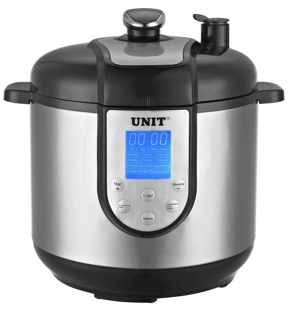 Unit USP-1210S. Capacity: 6 L, Power: 1100 W, Cooking programs: Meat, Soup, Steam. Colour of product: Black, Stainless steel, Display type: LCD