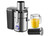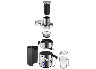 This JUICE CENTRE makes healthy enjoyment easy. Home-made fresh fruit and vegetable juices are lightning fast and easy to make. Time-consuming chopping of fruit and vegetables is not necessary thanks to 800 Watt power and automatic separation of fruit pulp and juice. The JUICE CENTRE is equipped with many practical features, like the extra large opening (Ø 8.5 cm), the large pulp container and the fine stainless steel filter. This vitamin supplier is not only exceptionally chic with its modern, timeless stainless steel design, but requires very little space thanks to the compact design. The large transparent juice container with approximately 1.1 litres capacity is included. The juice centre can be completely disassembled for easy cleaning. All non-electrical parts are dishwasher safe.